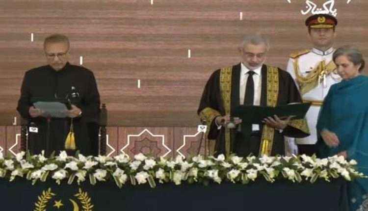 تقریب حلف برداری ایوان صدر اسلام آباد میں منعقد ہوئی جہاں صدر مملکت ڈاکٹر عارف علوی نے نو منتخب چیف جسٹس آف پاکستان جسٹس قاضی فائز عیسیٰ سے حلف لیا۔