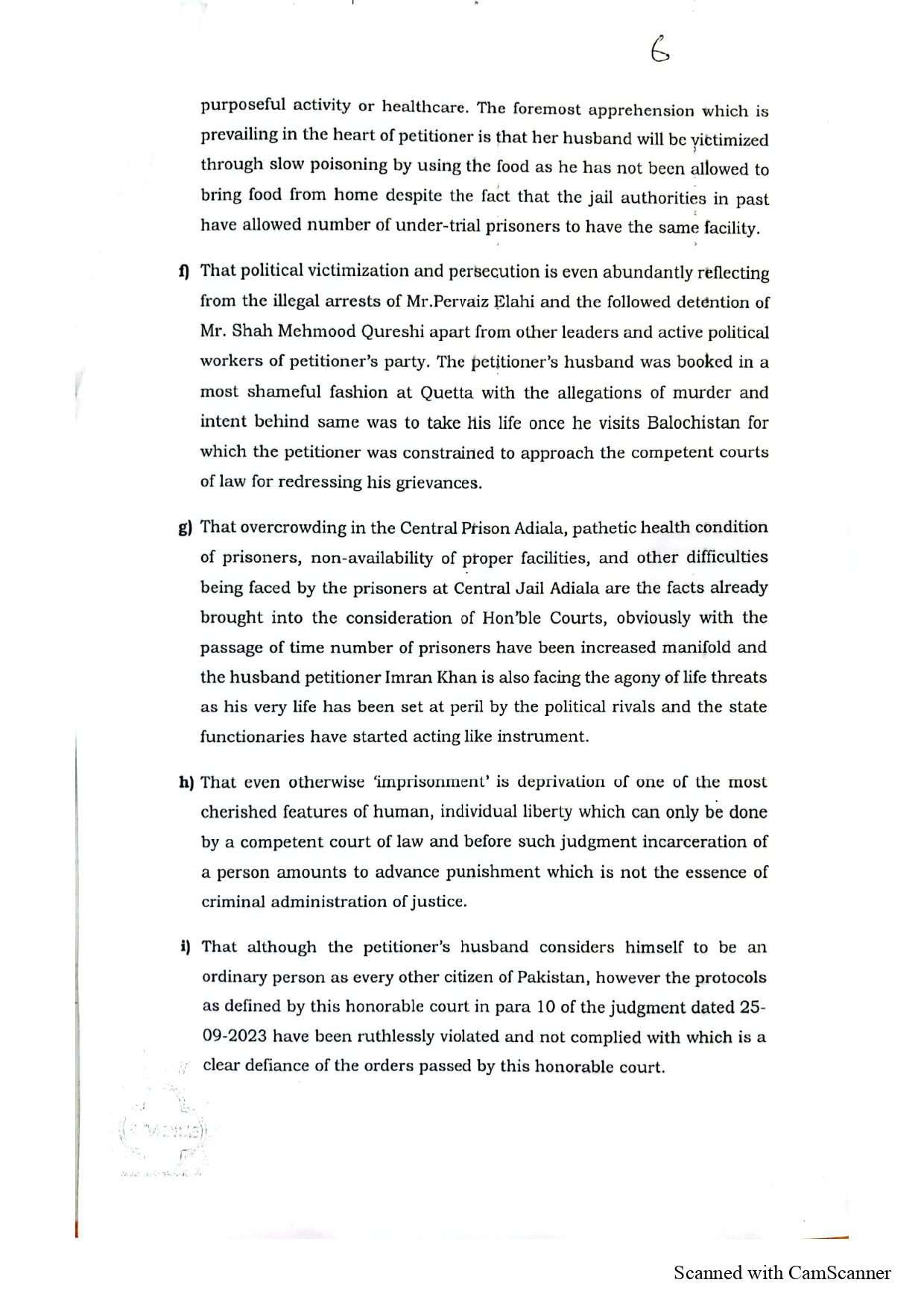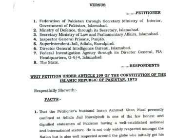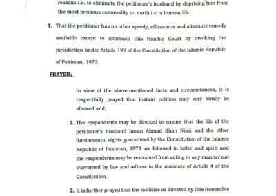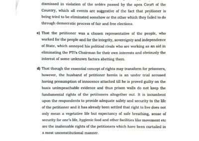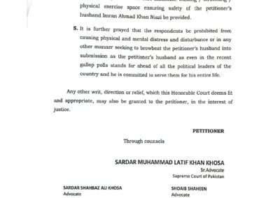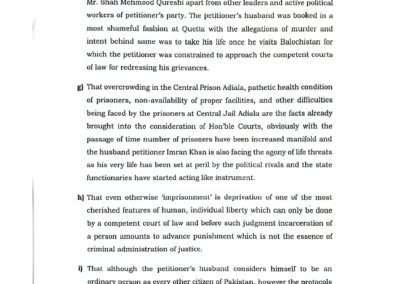 درخواست گزار کے شوہر کو انسانیت سوز طریقے سے زندگی کے بنیادی حق سے محروم کیا جارہا ہے،فوری توجہ نہیں دی گئی تو آہستہ آہستہ زہر دیکر مار دیا جائے گا۔درخواست میں مثالیں دے کرکہا گیا ہے کہ قیدیوں کو گھر سے خوراک کی اجازت دینے کی سہولت فراہم ہوئی لیکن عمران خان کو یہ سہولت نہیں دی جارہی،انھیں سیاسی انتقام کا نشانہ بنایا جارہا ہے۔اس ضمن میں پرویز الہی اور شاہ محمود قریشی کے ساتھ ہونے والے سلوک کو بطور ثبوت پیش کیا گیا ہے۔جبکہ کہا گیا ہے کہ شرمناک بھونڈے طریقے سے ان کے شوہر عمران خان کو کوئٹہ میں ایک وکیل کے قتل کے مقدمے میں ملزم نامزد کیا گیا۔
