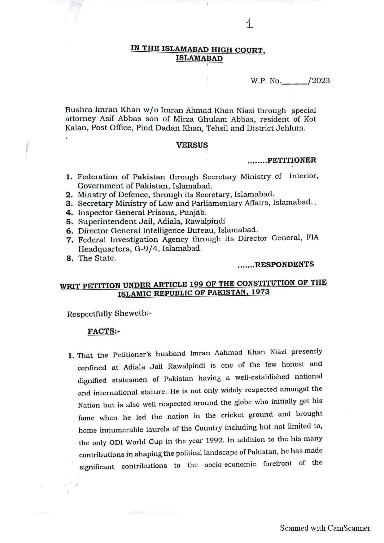 اسلام آباد (ای پی آئی )پاکستان تحریک انصاف کے چیئر مین عمران خان کی اہلیہ بشرٰی عمران خان نےاڈیالہ جیل میں اپنے شوہر کے ساتھ ہونے والے انسانیت سوز سلوک کو چیلنج کرتے ہوئے اسلام آباد ہائی کورٹ میں رٹ پٹیشن دائر کی ہے جس میں قانون،جیل رولز اور جیل منول کے مطابق برتائو کرنے اور زندگی کے بنیادی سہولیات فراہم کرنے کی استدعا کی گئی ہے۔