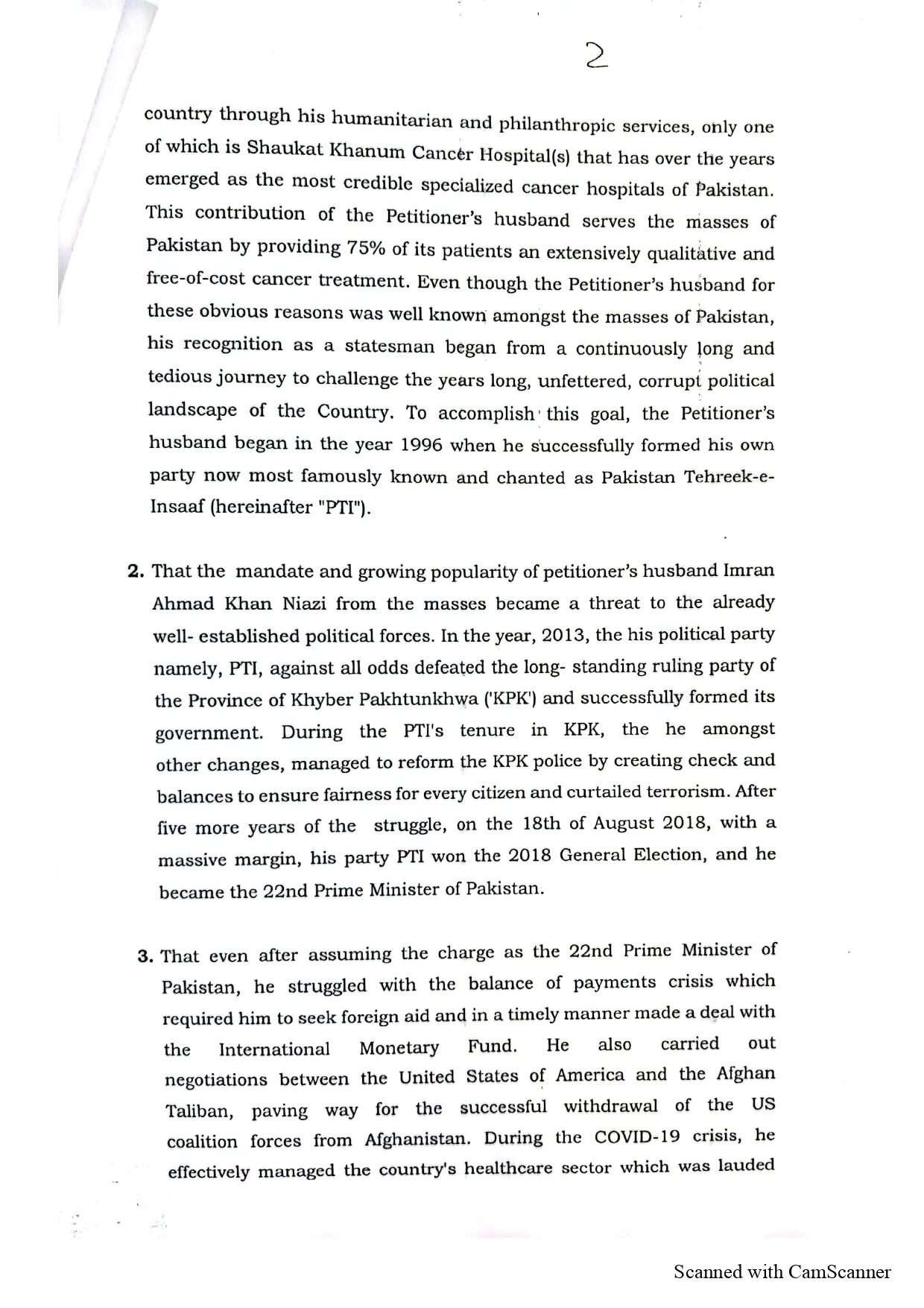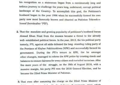 درخواست میں کہا گیا ہے کہ حالیہ گیلپ سروے کے مطابق پی ٹی آئی ملک کی سب سے مقبول سیاسی جماعت ہے اور عمران خان زندگی بھر عوام کی خدمات کے لیے پر عزم ہے۔درخواست میں عمران خان کی شخصیت اور بین الاقومی قد کاٹھ کا تفصیلی ذکر کیا گیا ہے اور بطور کرکٹر انھوں نے ملک کی قیادت کرتے ہوئے ورلڈ کپ جیتا جبکہ انسانیت کی خدمات میں شوکت خانم جیسا عظیم شان اسپتال کھڑا کیا جو 75فیصد کینسر کے مریضوں کو مفت علاج فراہم کررہا ہےاور بطور سیاست دان کرپٹ سیاسی کلچر کے خلاف کھڑا ہوکر پہلے خیبر پختون خواہ کی روایتی حکمران طبقے کو شکست سے دو چار کرکے صوبے میں حکومت بنائی اور اصلاحات کرکے پولیس میں چیک اینڈ بیلنس کا نظام قائم کیا،2018کے عام انتخابات میں کامیاب ہوکر ورثے میں ادائیگیوں کے توازن کو بہتر کرنے کے لیے آئی ایم ایف سے معاہدہ کیا،افغانستان اور امریکہ میں مذکرات کرواکر افغانستان سے امریکی فوج کو نکالنے کا راستہ ہموار کرایا،خواتین کو بااختیار کرنے کے لیے قانون سازی کی،