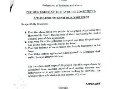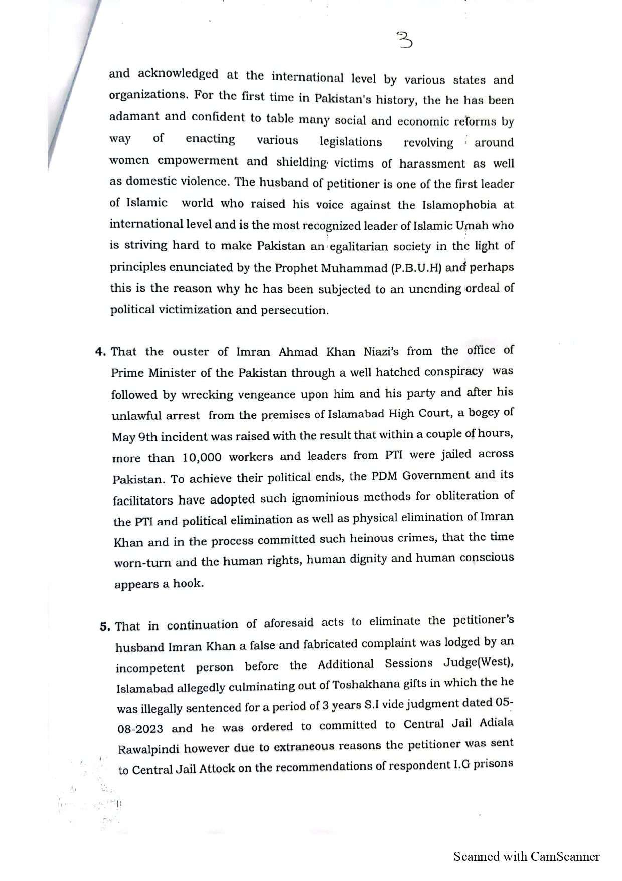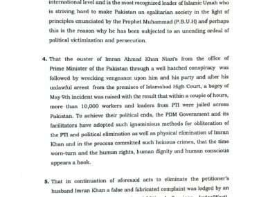درخواست میں کہا گیا ہے کہ عمرانخان نے اسلامو فوبیا کے خلاف عالمی سطح پر آواز اٹھائی اور رسول کریم کی تعلیمات کے مطابق مساوات پر مبنی معاشرہ قائم کرنے کے لیے جدوجہد شروع کی ۔ان وجوہات کی وجہ سے انھیں ہر طرف سے سیاسی ایذا رسانی کا شکار بنایا گیا،وزیر اعظم ہائوس سے نکالنے کے لیے سازش کرائی گئی ،پی ڈی ایم اور سہولت کاروں نے ہر طرف سے گھیر کر اقتدار سے محروم کردیا اور پھر نو مئی کے واقعے کا دلدل تیار کرکے اس کے ذریعے دس ہزار سے زیادہ سیاسی ورکرز اور قائدین گرفتار کیے گئے،پی ٹی آئی کو سیاسی طور پر ختم کرنے اور عمران خان کو جسمانی طور پر ختم کرنے کے لیے وہ وہ طریقے اپنائے گئے اور ایسے سنگین جرائم کا ارتکاب کیا گیا کہ جس کے سامنے انسانی وقار اور بنیادی حقوق بھی ماند پڑ جاتے ہیں،توشہ خانہ جیسا جھوٹے اور جعلی مقدمے بنائے گئے اور پھر اس میں سزا بھی دلوائی گئی۔