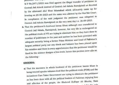 درخواست میں موقف اختیار کیا گیا ہے کہ پی ٹی آئی کی سیاسی حریف جماعتیں، سابق پی ڈی ایم حکومت اور موجودہ نگران حکومت عمران خان کو اسی طرح راستے سے ہٹانا چاہتے ہیں جس طرح ماضی میں سیاسی قیادت کو ہٹایا گیا۔اس ضمن میں سابق وزیر اعظم ذوالفقار علی بھٹو اور محترمہ بے نظیر بھٹو کی مثال دی گئی ہے اور کہا گیا ہے کہ ان لیڈران کو اس لیے سیاسی منظر نامے سے ہٹایا گیا کیونکہ یہ لوگ عوام اور ریاست کی سالمیت کے لیے کھڑے ہوگئے تھے۔