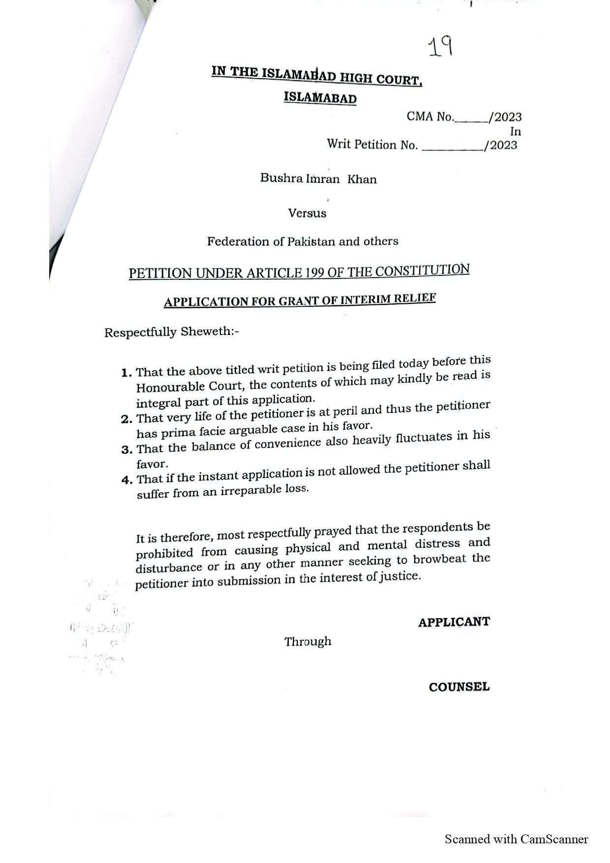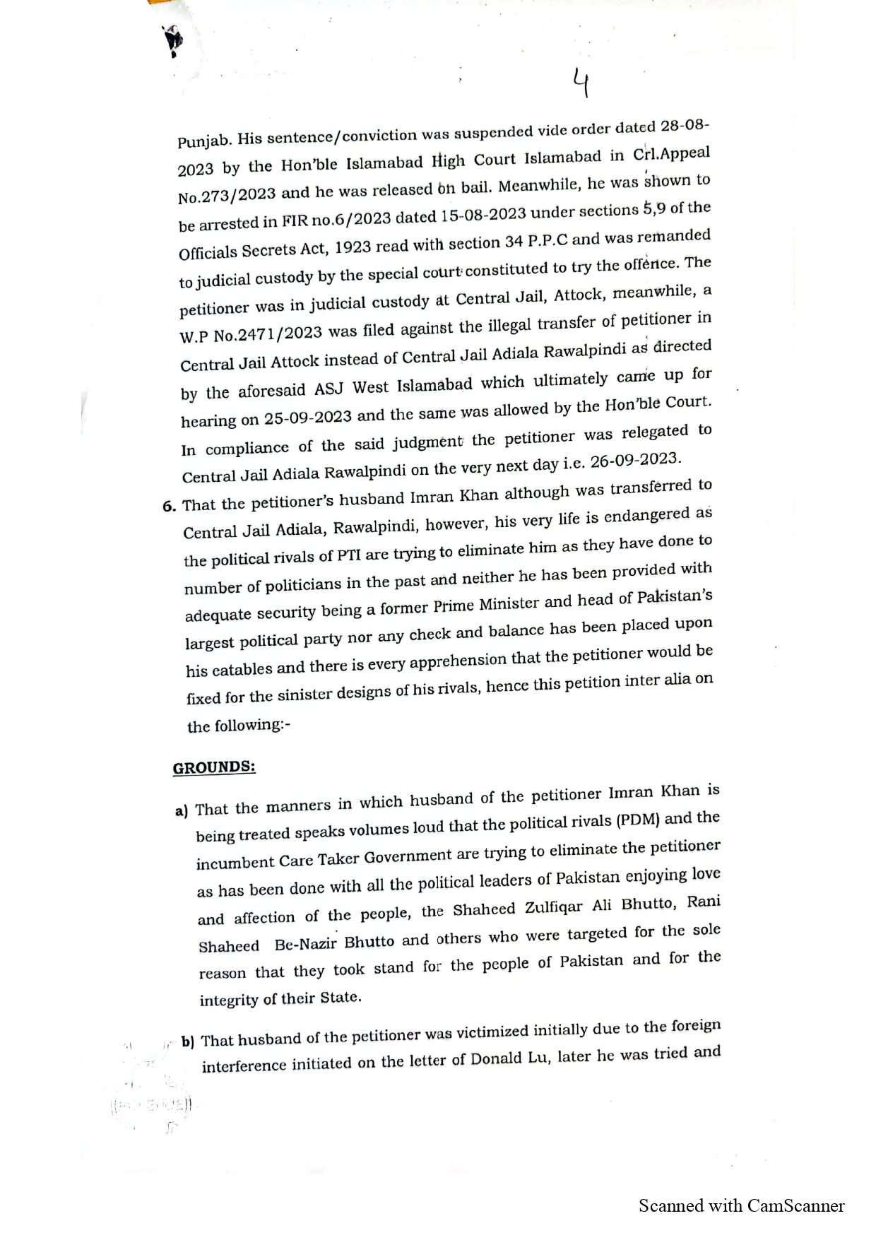 درخواست میں وفاقی پاکستان ریاست پاکستان،وزارت دفاع،سیکرٹری قانون و پارلیمانی امور،آئی جی جیل خانہ جات پنجاب،سپرنٹنڈنٹ اڈیالہ جیل،ڈی جی انٹلی جنس بیورو(آئی بی) اور ڈی جی ایف آئی اے کو فریق بنایا گیا ہے اور کہا گیا ہے کہ ان کے شوہر کو جیل میں جان سے مارنے کا خطرہ ہے، خدشہ ہے کہ عمران خان کو جیل میں زہر دے کر مار دیا جائے گا۔درخواست میں عمران خان کو اقتدار سے بے دخل کرنے کے لیے ہونے والی سازشوں،اقتدار سے محروم کرنے کے بعد جعلی مقدمات کے ذریعے ایذا رسانیوں کی تفصیلات بتاتے ہوئےکہا گیا ہے کہ مذکورہ سارے واقعات سے ثابت ہورہا ہے کہ آزادانہ اور شفاف الیکشن کے جمہوری عمل کے ذریعے عمران خان اور ان کی جماعت پی ٹی آئی کو ختم کرنے میں ناکامی پر ان کے شوہر کو جسمانی طور پر ختم کردیا جائے گا۔