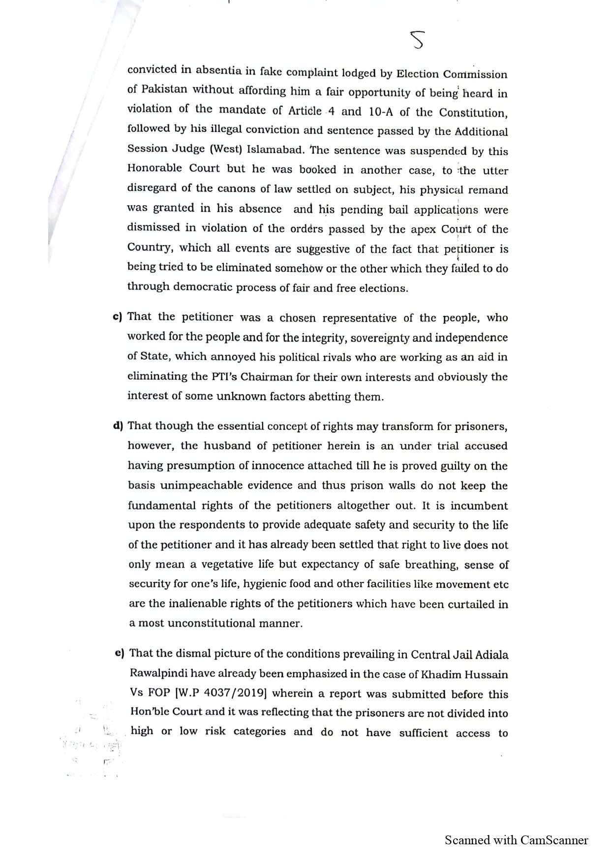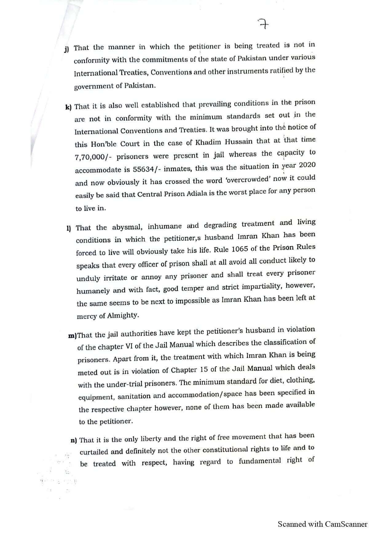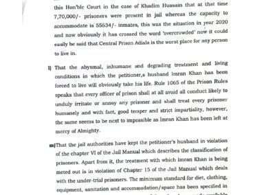 درخواست میں عمران خان کو غیر انسانی ماحول میں قید رکھنے کے بارے قانونی سوالات اٹھاتے ہوئے کہا گیا ہے کہ جب تک کسی ملزم کے خلاف الزام ثابت نہ ہو تو وہ بے گناہ تصور ہوتا ہے اور کسی بے گناہ کو غیر قانونی طور پر پابند سلاسل رکھ کر بنیادی انسانی حقوق سے محروم نہیں رکھا جاسکتا ۔زندگی صرف سانس لینے کا نام نہیں بلکہ یہ طے شدہ اصول قانون ہے کہ تحفظ کا احساس ،سکیورٹی ،صحت بخش غذا اور نقل و حرکت کی سہولت بھی زندگی کے حق میں شامل ہے۔