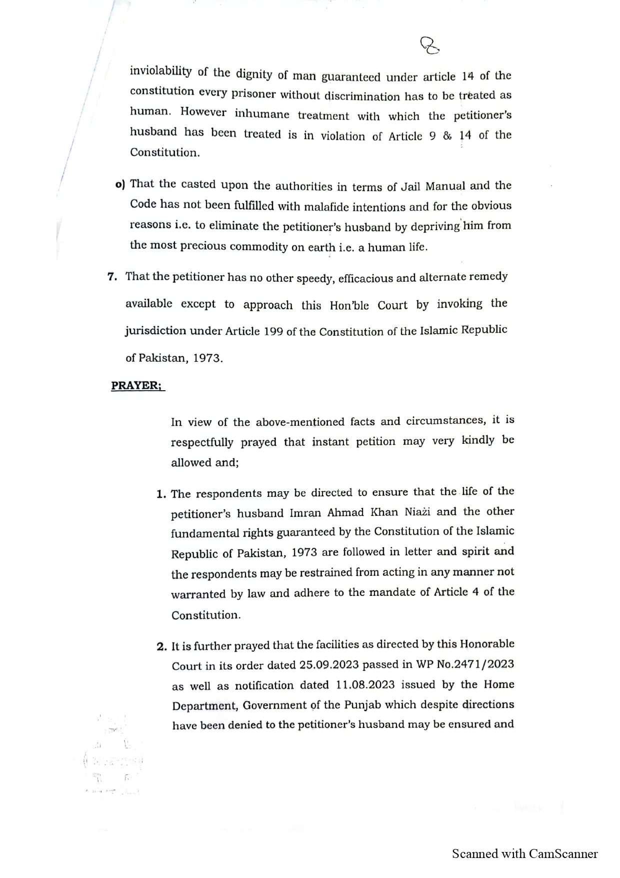 درخواست میں استدعا کی گئی ہے کہ انسانی زندگی ایک عظیم نعمت ہے اس لیے مخالف فریقین کو عمران خان کو تکالیف دینے سے روکا جائے جبکہ 25ستمبر کے عدالتی حکم اور 11اگست کے حکومت پنجاب کے نوٹی فکیشن کے مطابق عمران خان کو جیل میں سہولیات دی جائیں۔