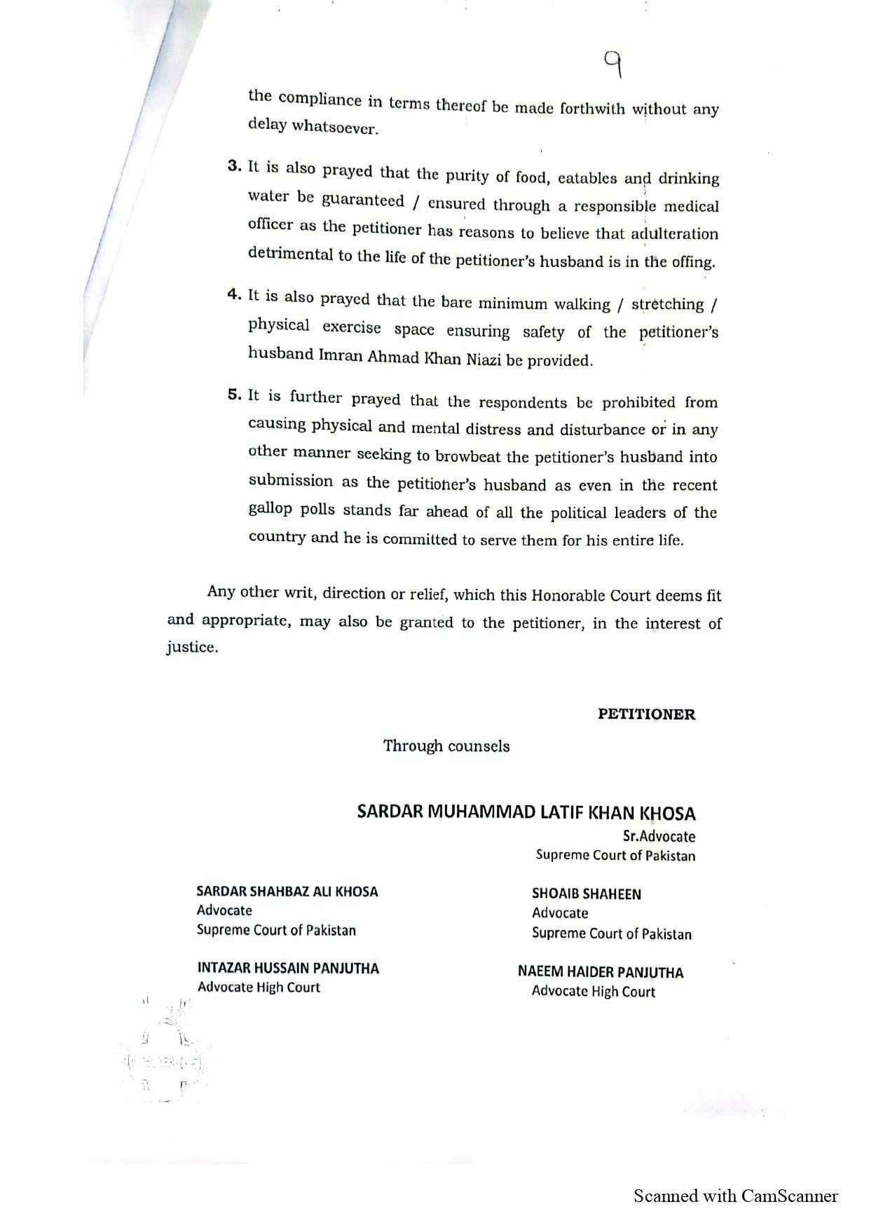 یہ بھی استدعا کی گئی ہے کہ ذمہ دار میڈیکل افسر کے ذریعے عمران خان کو خوراک اور پینے کا پانی دیا جائے جبکہ چہل قدمی اور ورزش کے لیے مناسب جگہ فراہم کی جائے۔مخالفین فریقین کو پابند کیا جائے کہ وہ عمران خان کو ذہنی و جسمانی تکلیف نہ دے۔