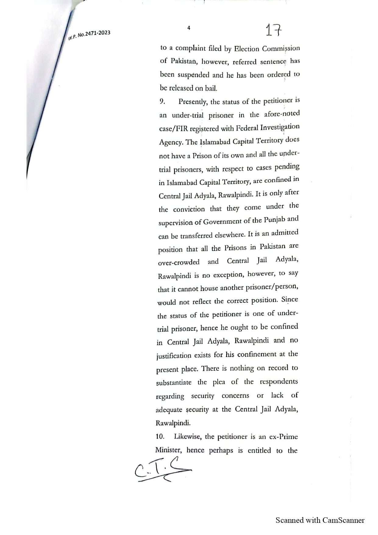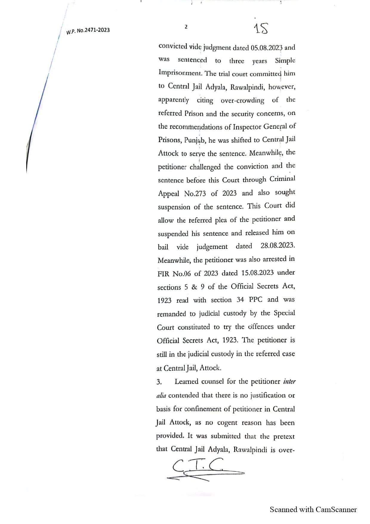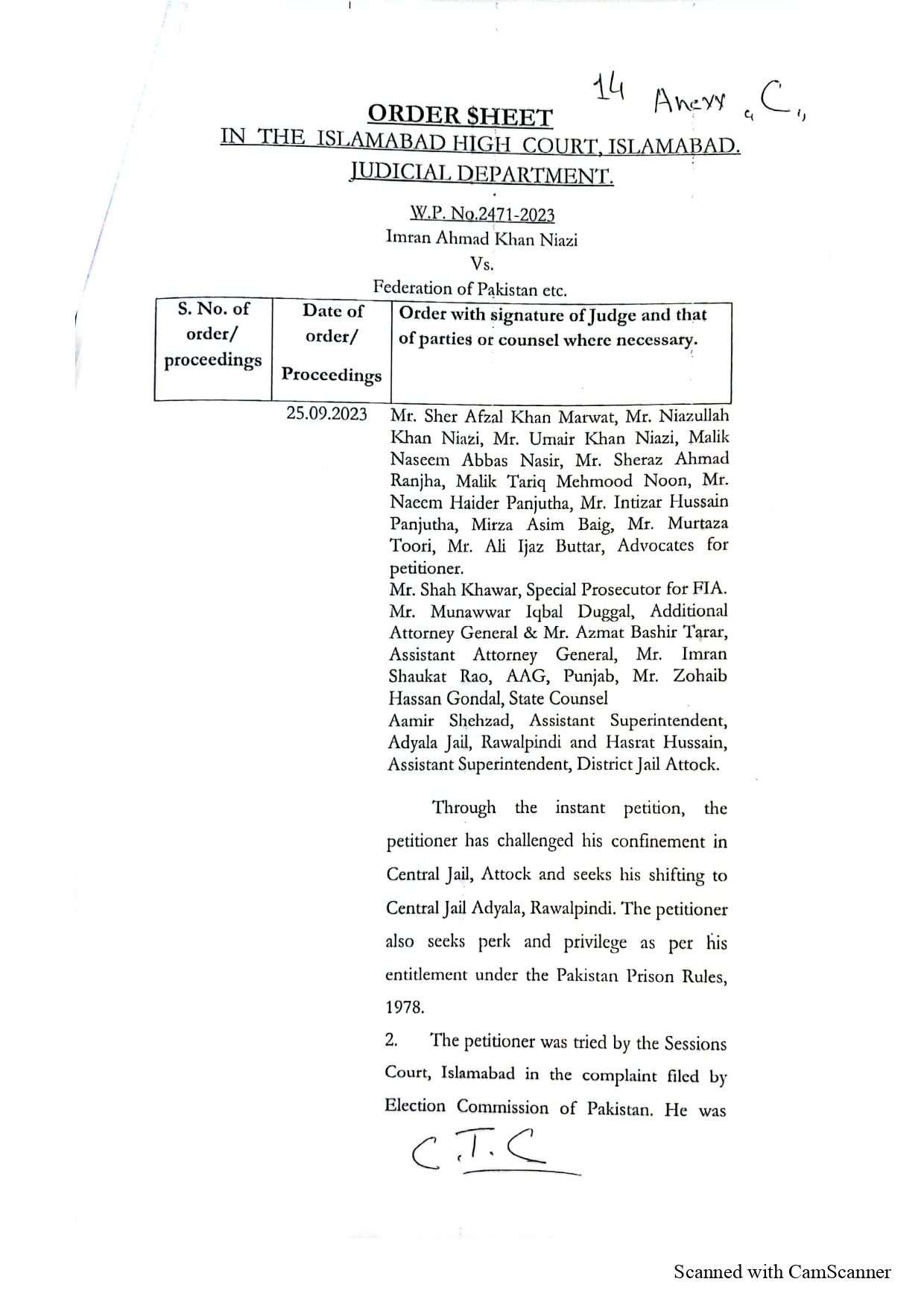 درخواست میں کہا گیا ہے کہ عمران خان کسی خاص سلوک کا متمنی نہیں لیکن ہائی کورٹ نے 25ستمبر کے آرڈر میں جو سہولیات فراہم کرنے کا حکم دیا وہ بھی فراہم نہیں کی جارہی اور کھلی طور پر توہین عدالت کی جارہی ہے۔