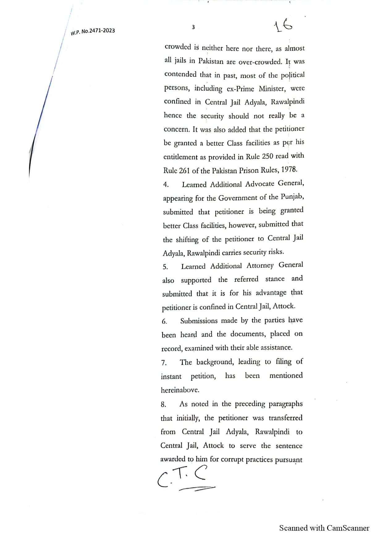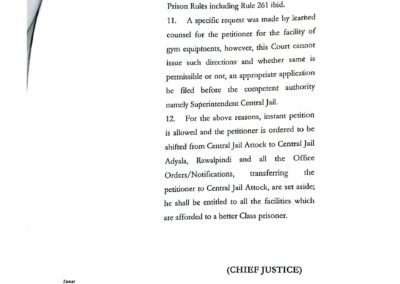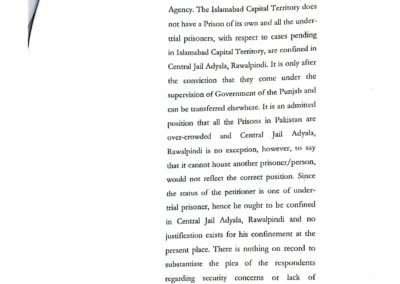 درخواست میں اڈیالہ جیل کے غیر انسانی ماحول کا پورا نقشہ کھینچا گیا ہے اور اس ضمن میں خادم حسین کیس میں پیش کی گئی رپورٹ کا حوالہ بھی دیا گیا ہے۔رپورٹ کے مطابق اڈیالہ جیل میں گنجائش سے کئی گناہ زیادہ قیدی موجود ہونے کے علاوہ صحت و صفائی کی مخدوش صورتحال اور ناقص خوراک کی فراہمی بھی معمول ہے۔