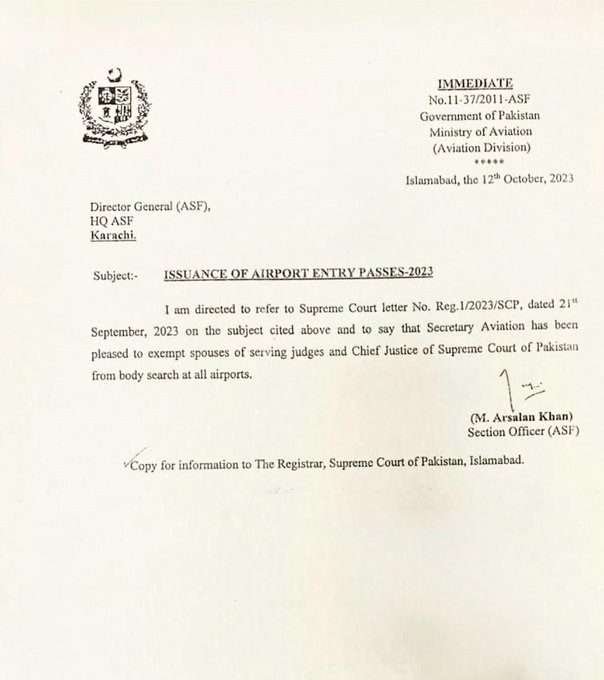 جاری حکمنامے میں کہا گیا ہے ملک بھر کے ہوائی اڈوں پر حاضر سروس ججز، چیف جسٹس اور ان کی اہلیہ کی تلاشی نہیں ہوگی۔