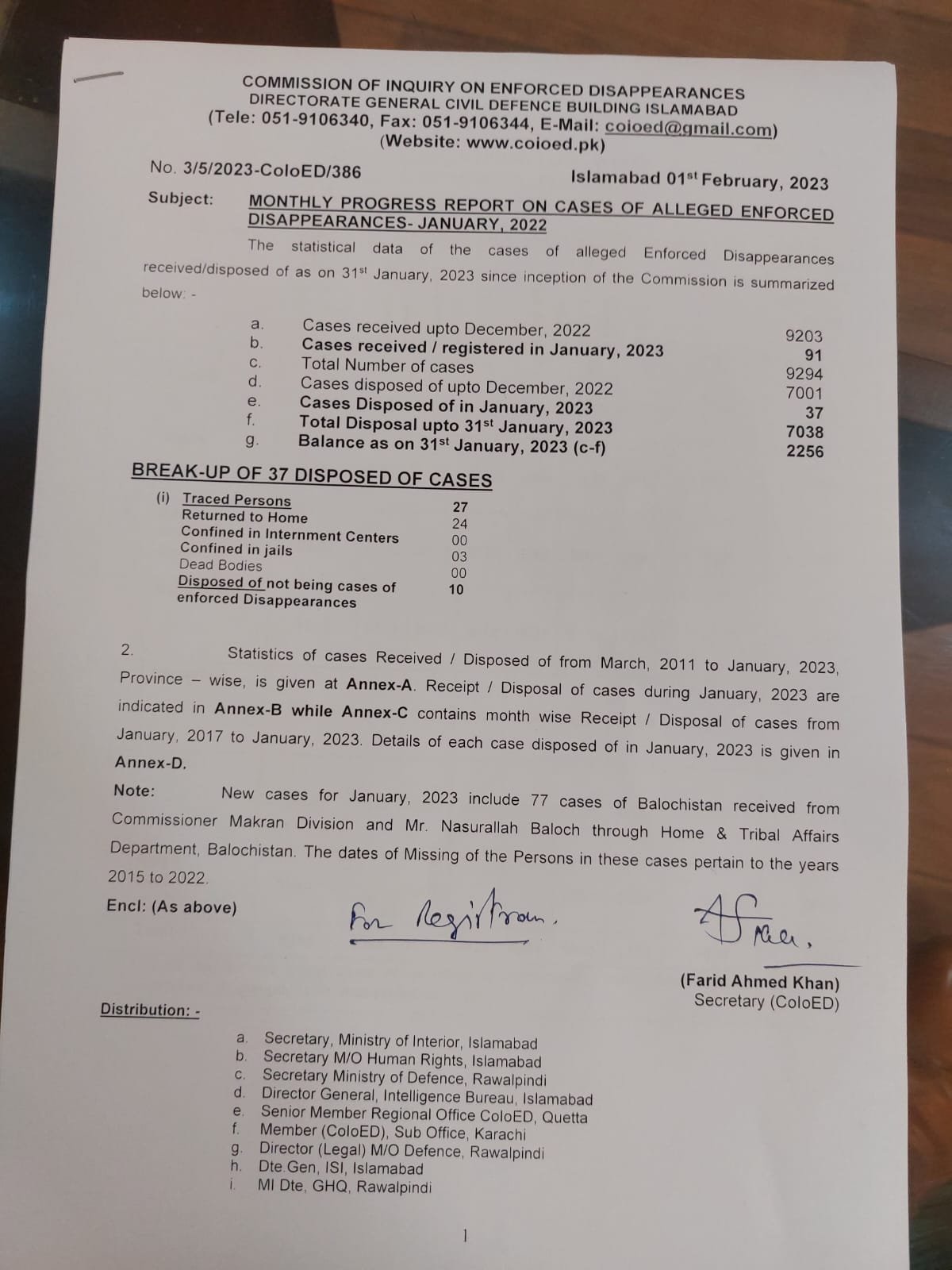 ایگزیکٹ پریس انٹرنیشنل (ای پی آئی نیوز) کو دستیاب کمیشن کی تحریری رپورٹ کے مطابق کمیشن نے سال 2023کے پہلے مہینے میں 37لاپتہ افراد کے مقدمات نمٹادیئے ہیں جس کے بعد کمیشن کے پاس زیر التوا درخواستوں کی2255رہ گئی ہے۔بارہ سال قبل قائم کئے گئے کمیشن کو اب تک کل 9294لاپتہ افراد کی بازیابی کےلئے درخواستیں موصول ہوئی ہیں جن میں 7038درخواستیں نمٹا دی گئی ہیں ۔ کمیشن کی رپورٹ کے مطابق جنوری میں کمیشن کو کل 91لاپتہ افراد کی درخواستیں موصول ہوئی ہیں ۔
