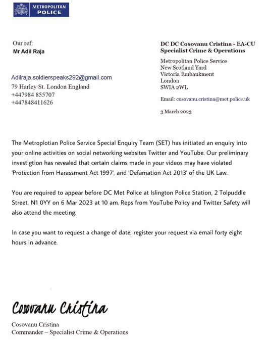 نوٹس میں کہا گیا ہے کہ آپ (عادل راجہ) ڈی سی میٹروپولیٹین پولیس آئلسٹنگٹن پولیس اسٹیشن 2میں صبح دس بجے پیش ہوں ، اس میٹنگ میں یوٹیوب پالیسی اور ٹویٹرسیفٹی کے نمائندگان بھی شرکت کریں گے۔