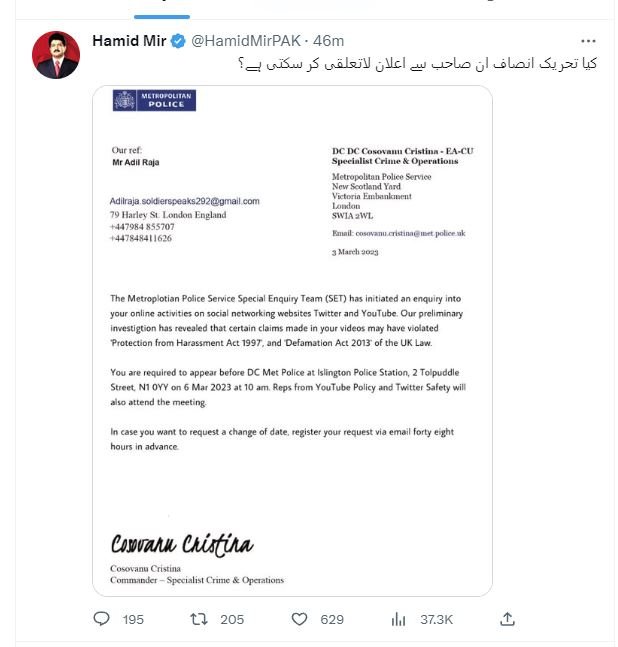 پاکستان کے سینئر صحافی حامد میر نے اپنی ٹویٹ میں برطانوی پولیس کا نوٹس شیئر کرتے ہوئے سوال کیا ہے کہ کیا تحریک انصاف ان صاحب سے اعلان لاتعلقی کر سکتی ہے؟